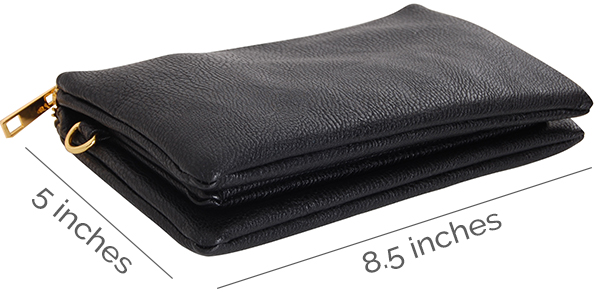 This simple vegan leather wristlet wallet comes with a detachable and adjustable wrist strap and cross body strap to easily convert from a stylish small clutch purse to a trendy crossbody wristlet purse or small shoulder bag. The spacious and expandable interior features credit card slots, a zippered pocket for change, and compartments for phone, keys, makeup, checkbook, or even a passport for travel.