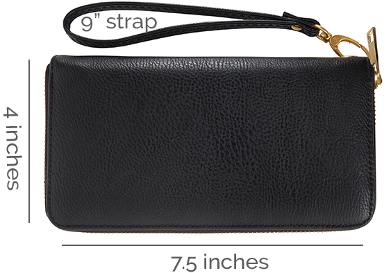 In rich, pebbled vegan leather, this continental zip around wallet is a timeless classic. With a zippered interior change purse, eight credit card slots, two billfolds, four additional internal compartments, and an included wristlet strap, this versatile accessory will keep you organized in style. Dimensions: 7.75" x 3.75"